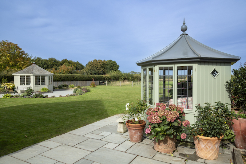 The larger summerhouse offers a calm retreat in the morning sun or a shaded sanctuary on warmer afternoons, while the smaller 2.4m model is perfectly placed to capture the late afternoon and evening light. Positioned on the edge of open fields, both provide welcome shelter from the breeze , creating tranquil spaces to unwind in comfort.